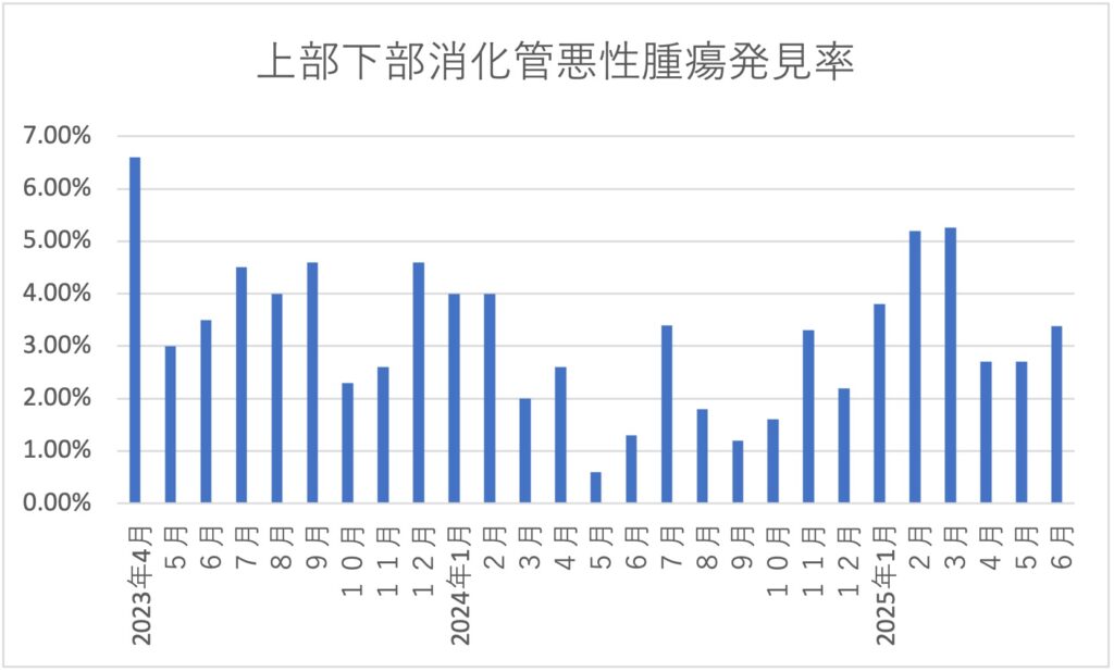 例年通り6月から、内視鏡件数の増加に伴い、悪性腫瘍発見数も増加します。