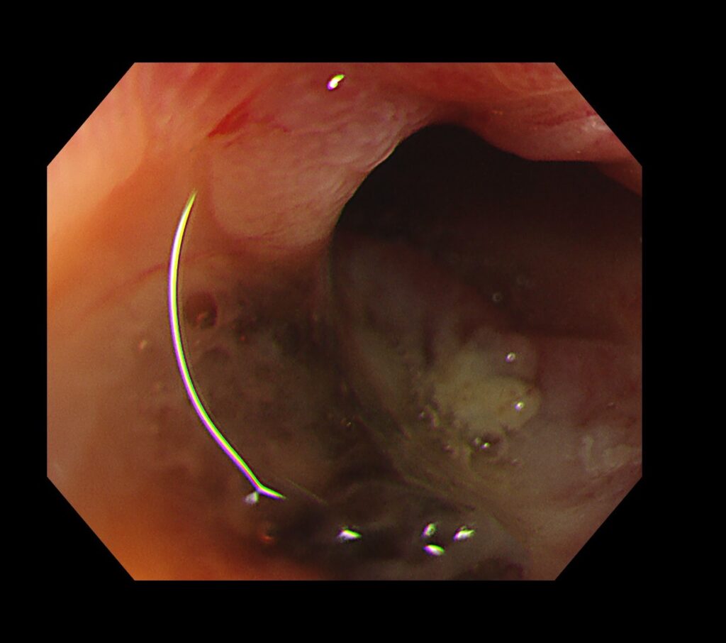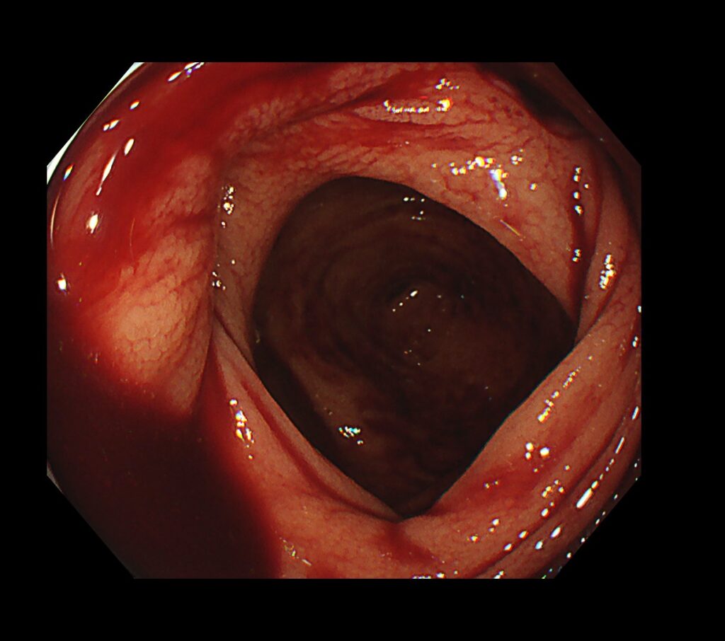 大量の便とコアグラ(血糊)の中、盲腸まで挿入すると新鮮血のたまり場がありました。