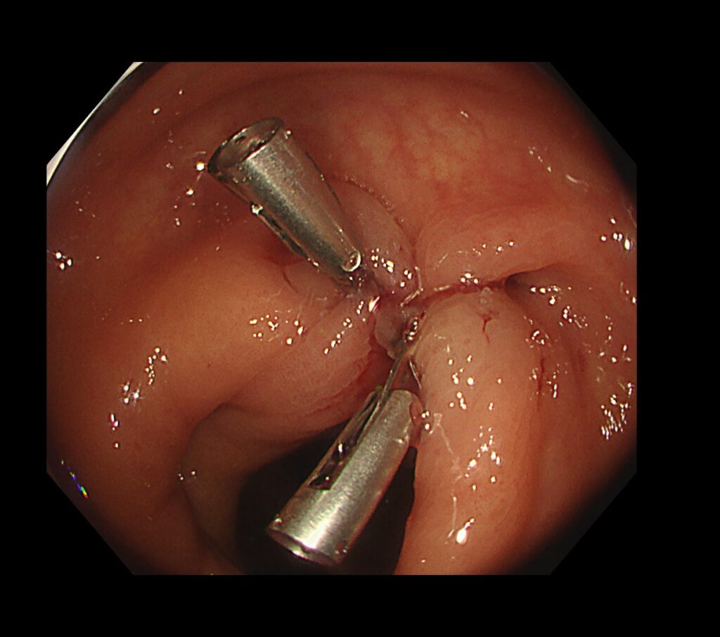 動脈を高周波を用いて凝固処置を加え、責任憩室を医療用クリップで閉鎖、完全止血が得られました。