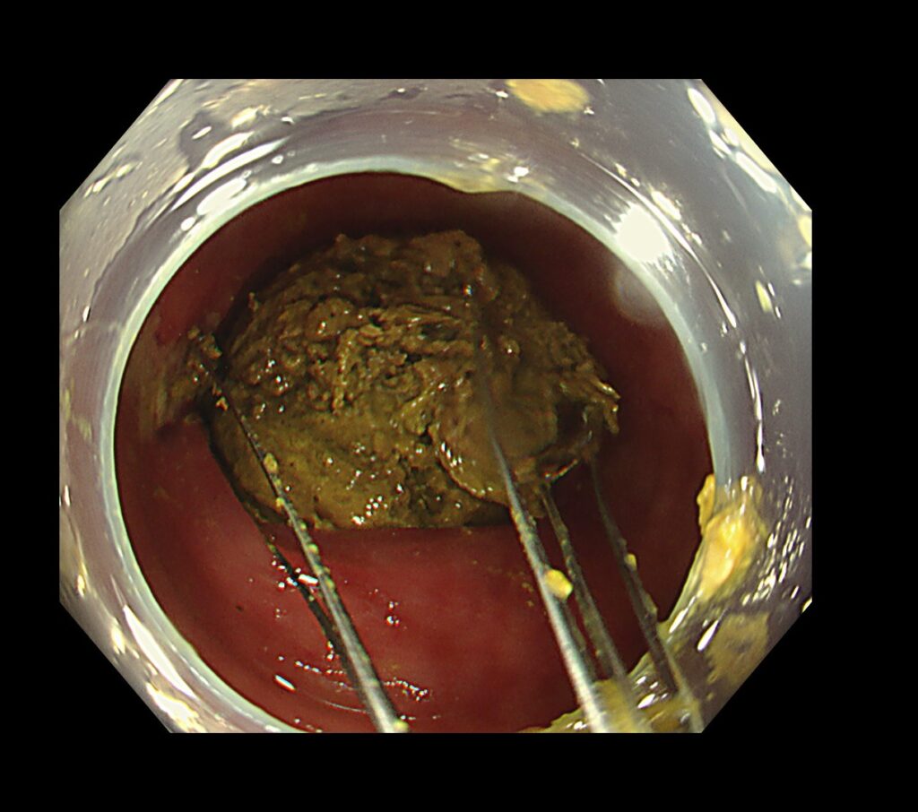 糞石を内視鏡処置具で破砕していくと、何層にも重なり合う便の層を認めました。