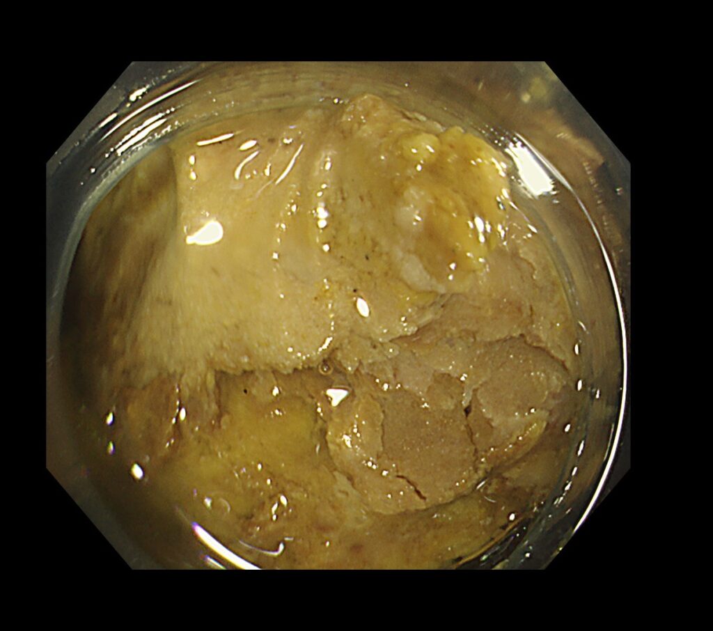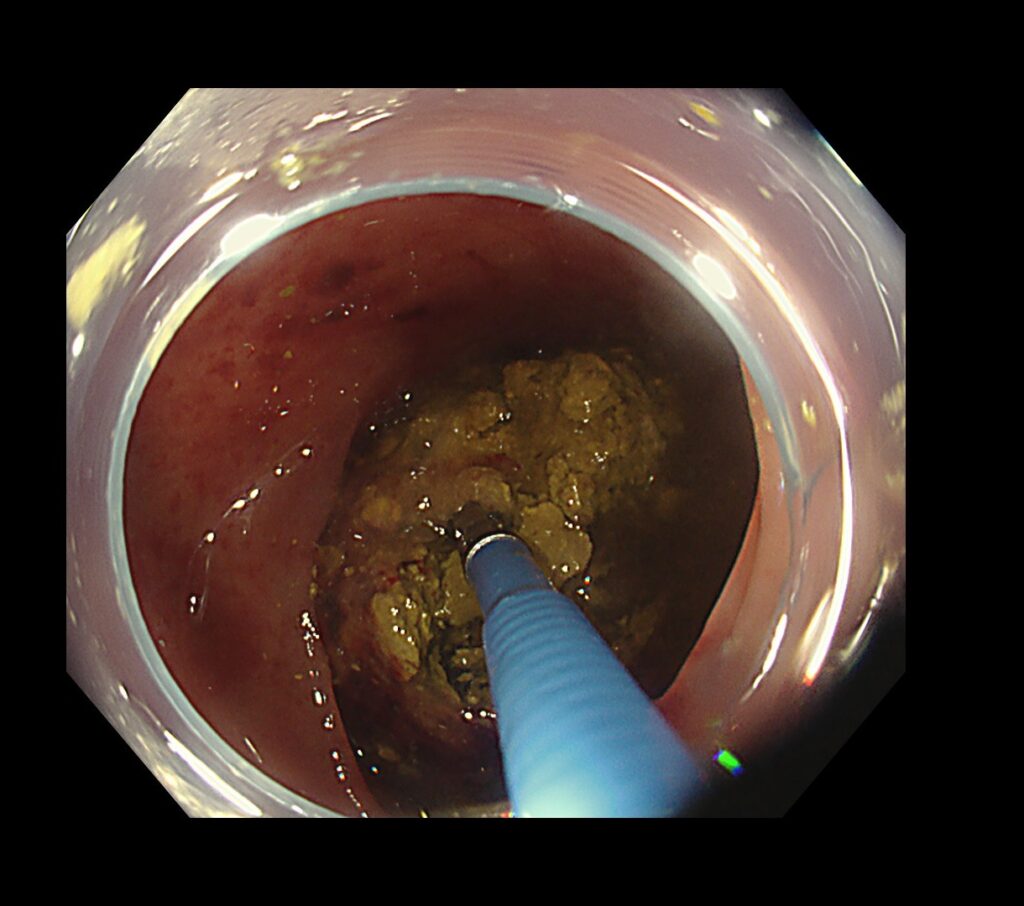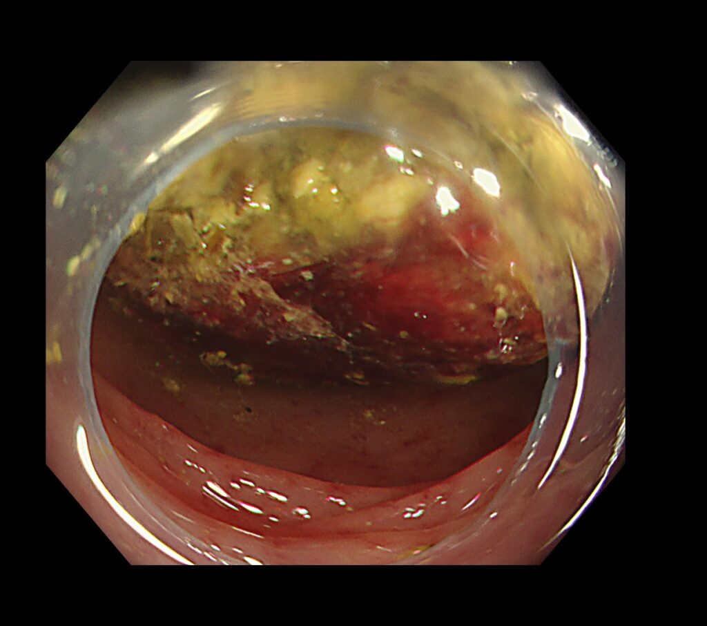 糞石による閉塞性大腸炎をきたしており、粘膜からの出血と腸に嵌頓する糞石を認めました。
