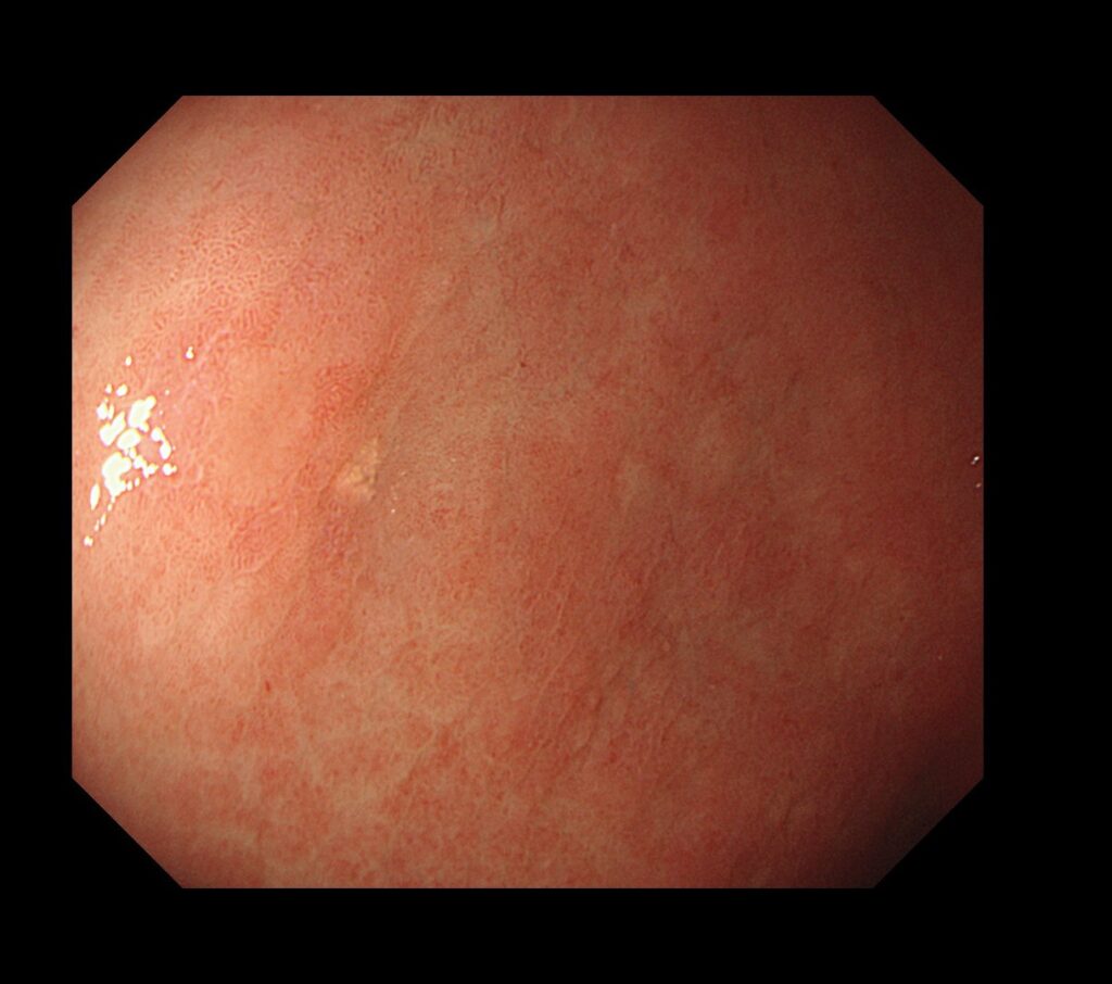 通常光では、癌の指摘ができない状態と思われます。ピロリ菌除菌後ということもあり、病変は忍者のように隠れています。