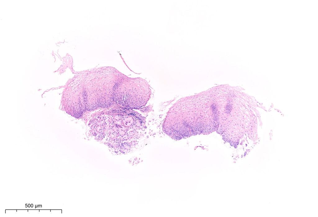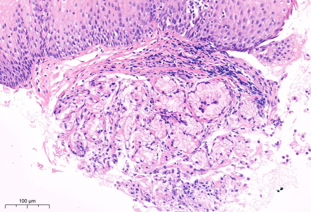 病理組織像では、重層扁平上皮の下に、腺組織の増生を認めます。