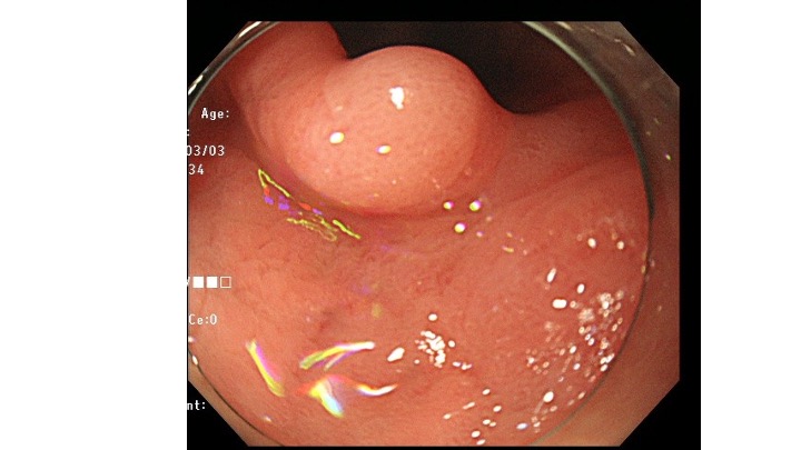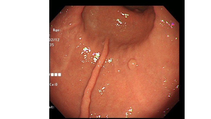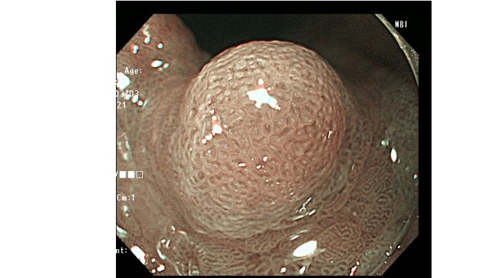 今回提示する症例(ピロリ除菌後)は、隆起型の早期胃癌で、表層に癌の露出を認めない早期胃癌です。