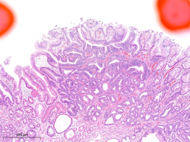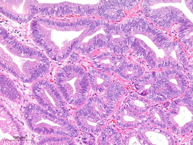 核の形状も類円形>紡錘形、重積が強く、高異型度高分化型腺癌(High grade)の診断としております。