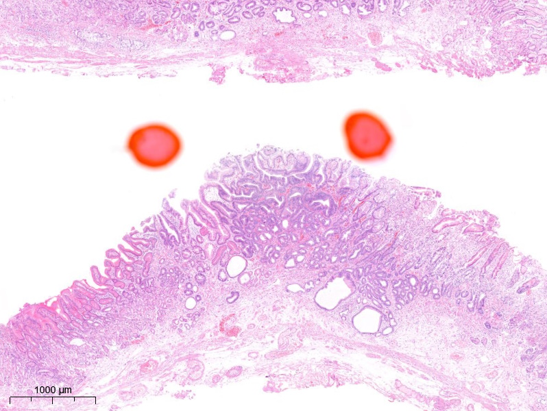 ピロリ菌の除菌に伴い、平坦な早期胃癌は、表層に一層非癌上皮を認めることが多いということがわかっています。