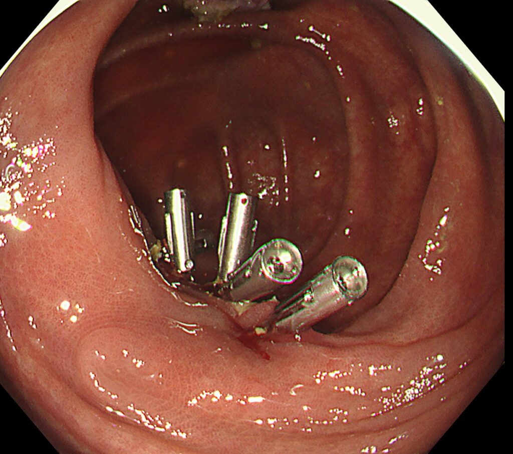 病変の摘出に成功します。出血予防にクリップで創部を完全閉鎖します。