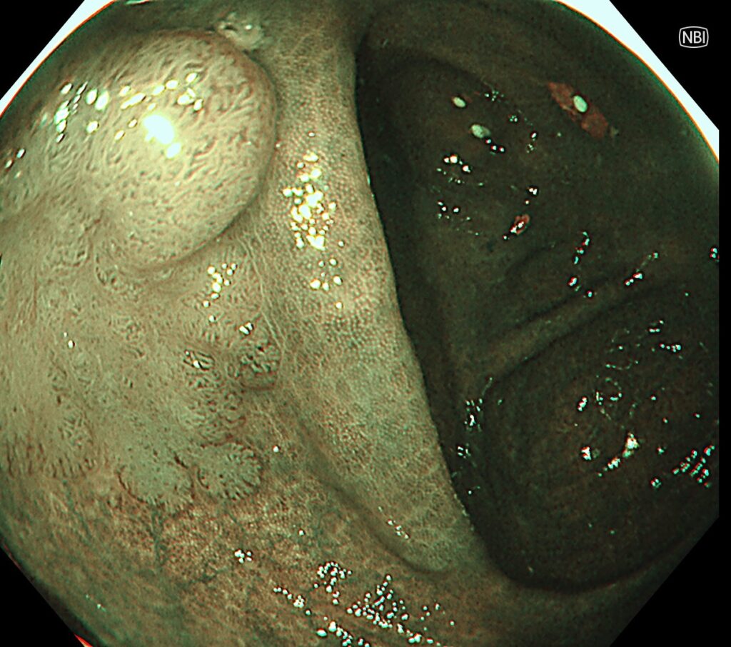 隆起+平坦な領域をもつ腫瘍が隠れていました。NBI観察で範囲診断して、腫瘍の範囲をマーキングしていきます。